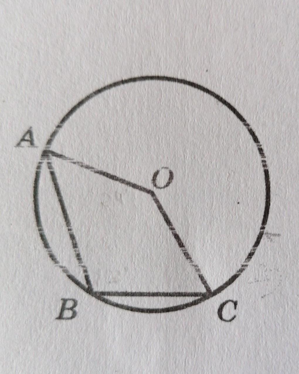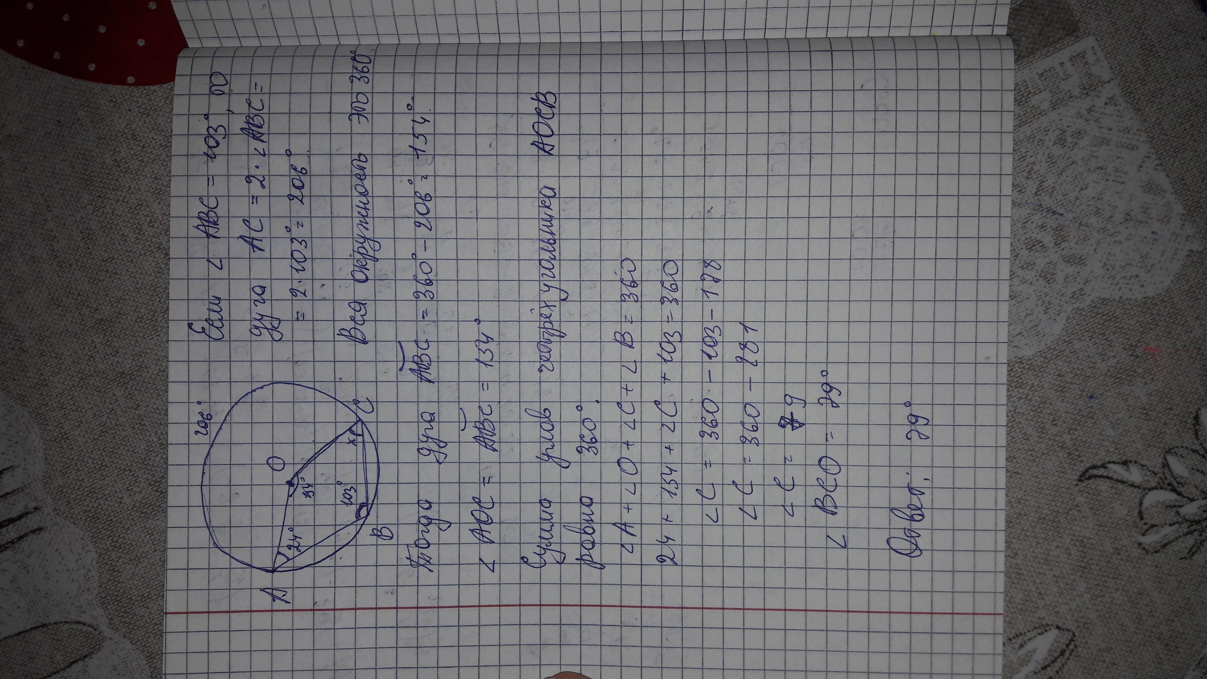 Точка О - центр окружности, на которой лежат точки A, B и C. Известно, что угол ABC = 103° и угол OAB = 24°. Найдите угол BCO. Ответ дайте в градусах.