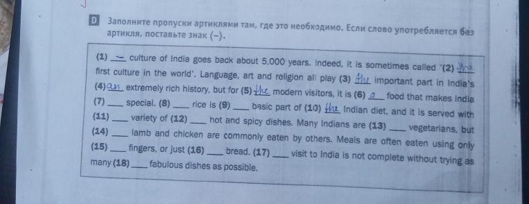 (1) The culture of India goes back about 5,000 years. Indeed, it is sometimes called '(2) the first culture in the world'. Language, art and religion all play (3) an important part in India’s (4) (-) extremely rich history, but for (5) (-) modern visitors, it is (6) the food that makes India (7) (-) special. (8) (-) Rice is (9) a basic part of (10) (-) Indian diet, and it is served with (11) a variety of (12) (-) hot and spicy dishes. Many Indians are (13) (-) vegetarians, but (14) (-) lamb and chicken are commonly eaten by others. Meals are often eaten using only (15) (-) fingers, or just (16) (-) bread. (17) A visit to India is not complete without trying as many (18) (-) fabulous dishes as possible.