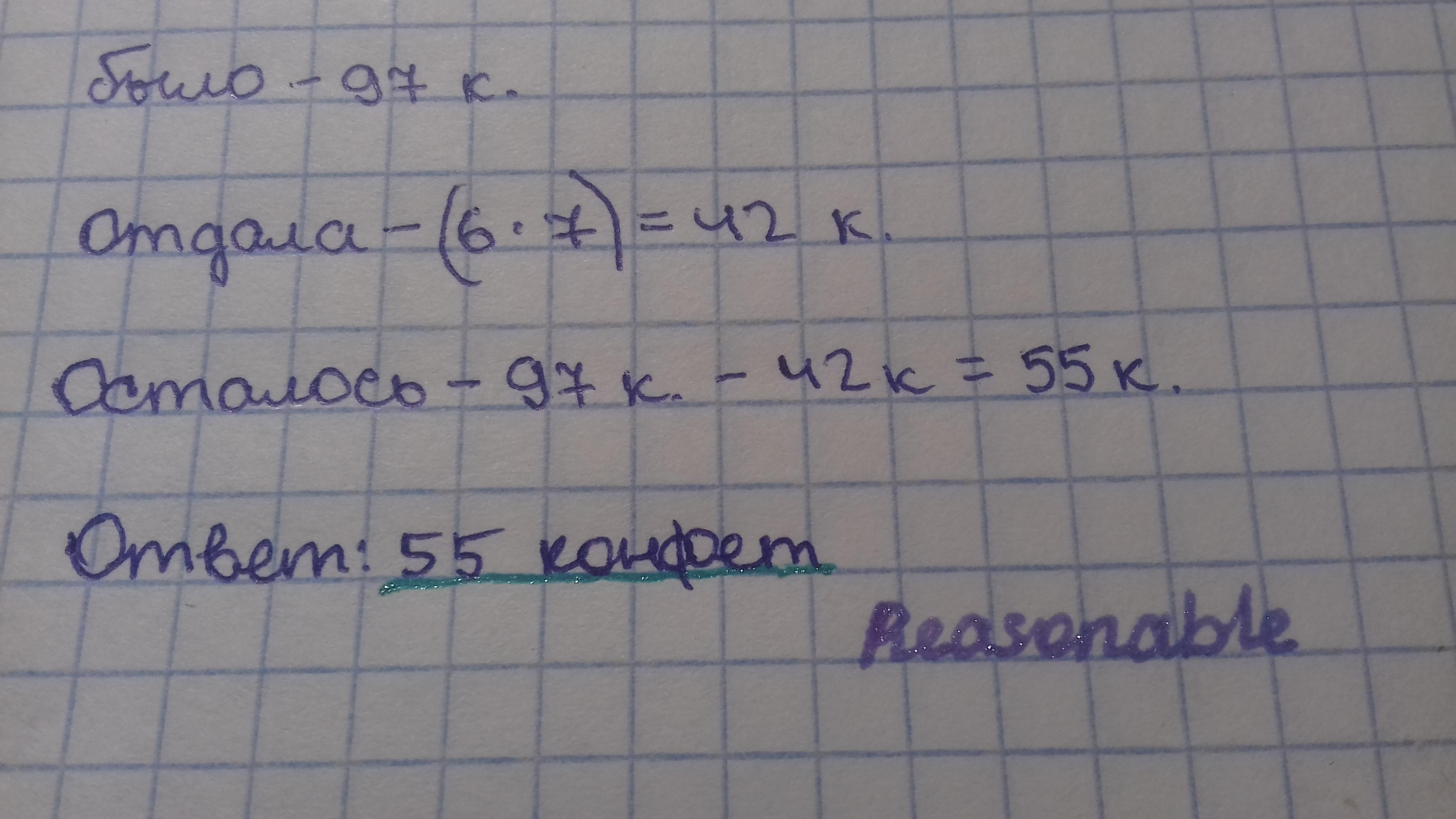 У Вити было 39 конфет ему Олеля кинула еще 6*7 конфет сколько конфет осталось у Олеси если у нее было 97 конфет?