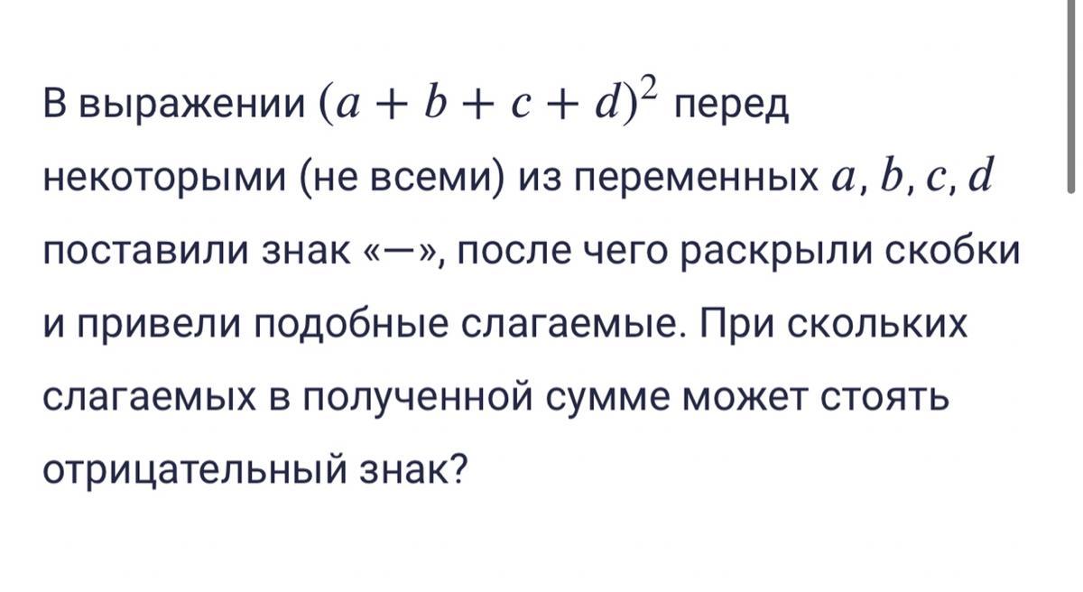», после чего раскрыли скобки и привели подобные слагаемые. При скольких слагаемых в полученной сумме может стоять отрицательный знак?