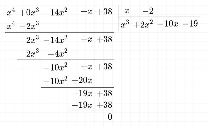 Это значит, что уравнение х⁴-14х²+х+38=0 делится без остатка на х-2. В результате деления получаем х³+2х²-10х-19 (деление на картинке).