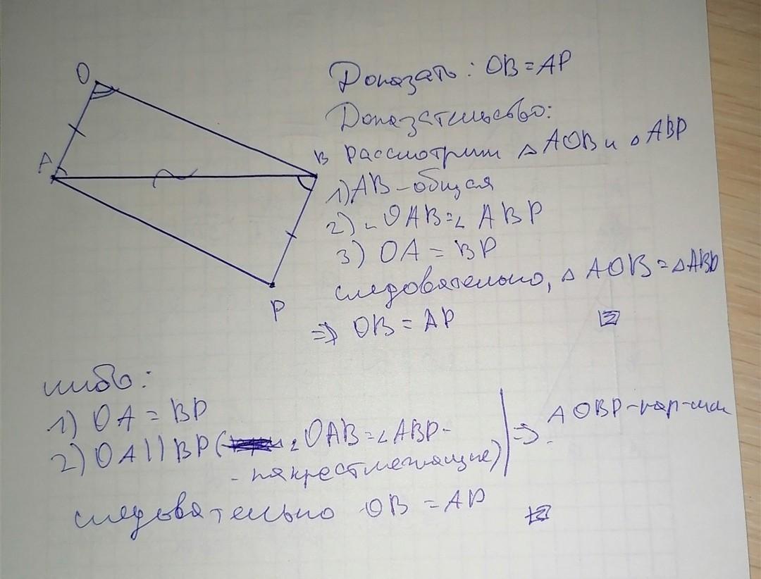 Точки O и P расположены в разных полуплоскостях относительно прямой AB так, что AO=BP И угол OAB=углу PBA. Докажите что OB=AP