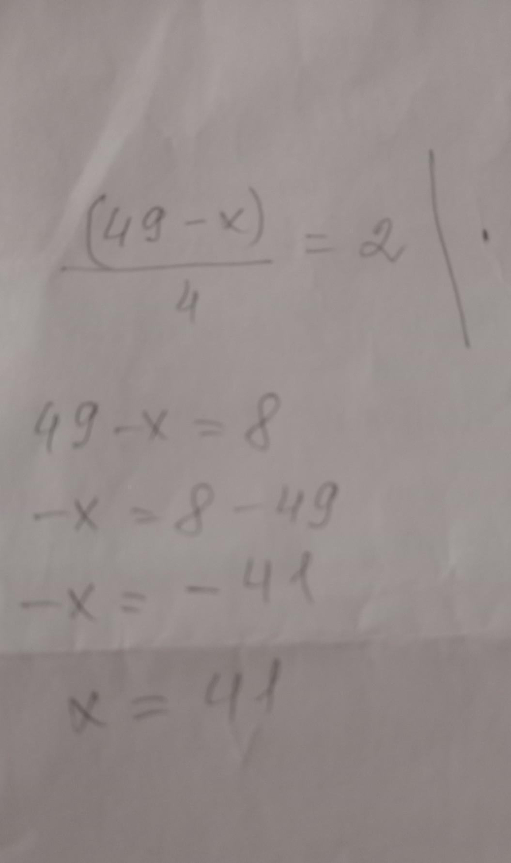 Чтобы найти х, найдем сначала скобку, в которой он есть. Скобка - делимое. Оно равно делитель, умноженному на частное. 49-х=4*2; 49-х=8; х - вычитаемое. х=49-8=41.