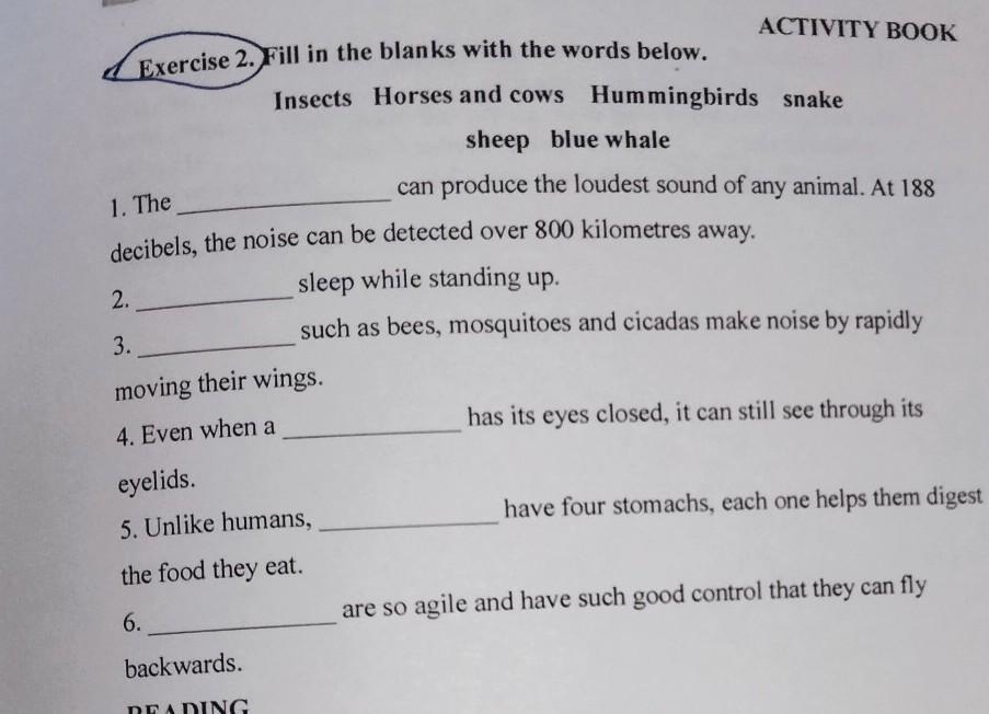 ACTIVITY BOOK Exercise 2. Fill in the blanks with the words below. Insects Horses and cows Hummingbirds snake sheep blue whale 1. The can produce the loudest sound of any animal. At 188 decibels, the noise can be detected over 800 kilometres away. sleep while standing up. 2. 3. such as bees, mosquitoes and cicadas make noise by rapidly moving their wings. 4. Even when a has its eyes closed, it can still see through its eyelids. 5. Unlike humans, have four stomachs, each one helps them digest the food they eat. 6. are so agile and have such good control that they can fly backwards.