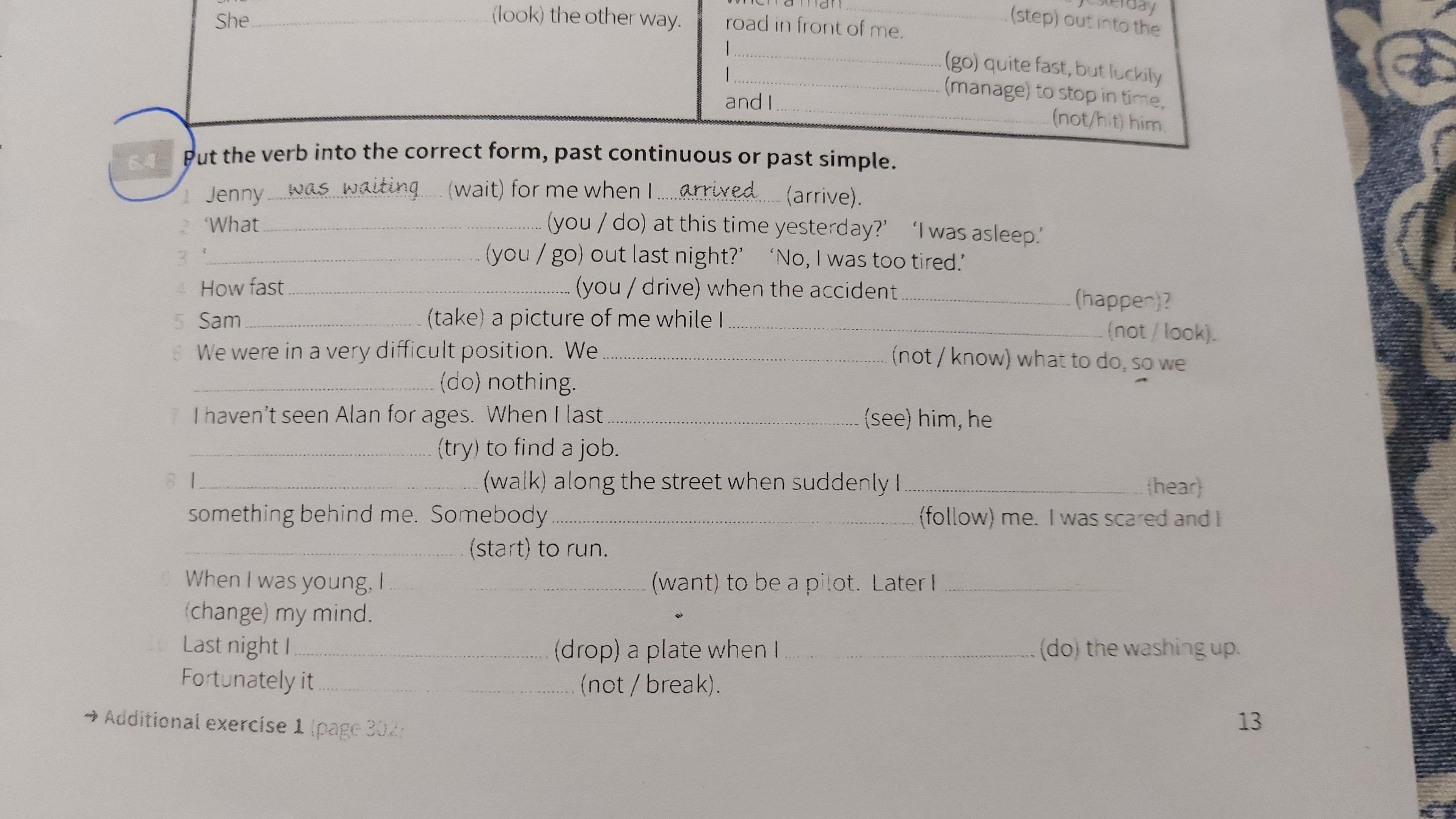 8)I was walking along the street when suddenly I heard something behind me. Somebody followed me. I was scared and I started to run.