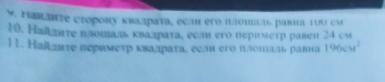 3) 196=14*14 значит сторона квадрата равна 14 Р=(14+14)*2=56 Р=14*4=56