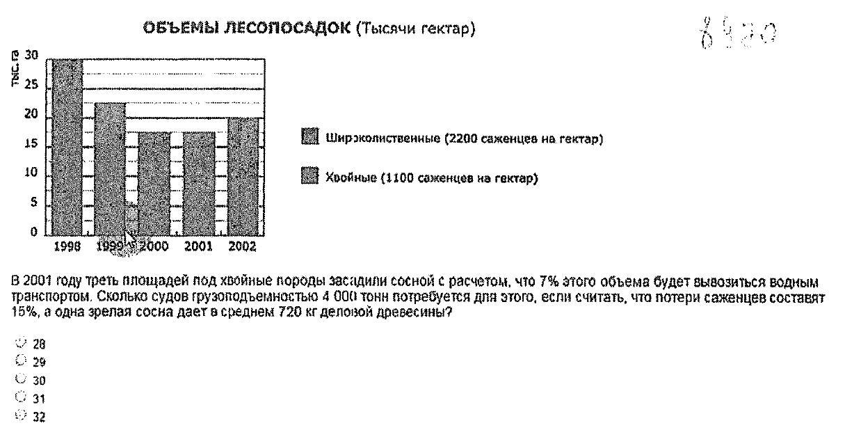 В 2001 году треть площадей под хвойные породы засадили сосной с расчетом, что 7% этого объема будет вывозиться водным транспортом. Сколько судов грузоподъемностью 4 008 тонн потребуется для этого, если считать, что потери саженцев составят 15%, а одна зрелая сосна дает в среднем 720 кг деловой древесины?