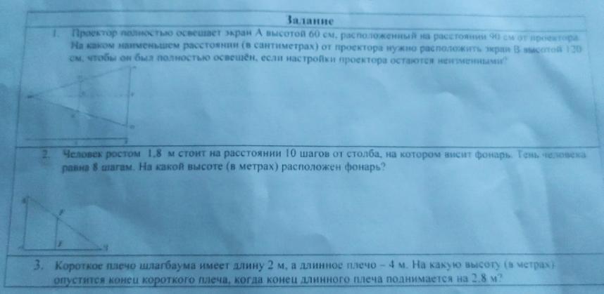 Проектор полностью освещает экран А высотой 60см, расположенный на расстоянии 90см от проектора. На каком наименьшем расстоянии ( в сантиметрах) от проектора нужно расположить экран В высотой 120см, чтобы он был полностью освещён, если настройки проектора остаются неизменными?