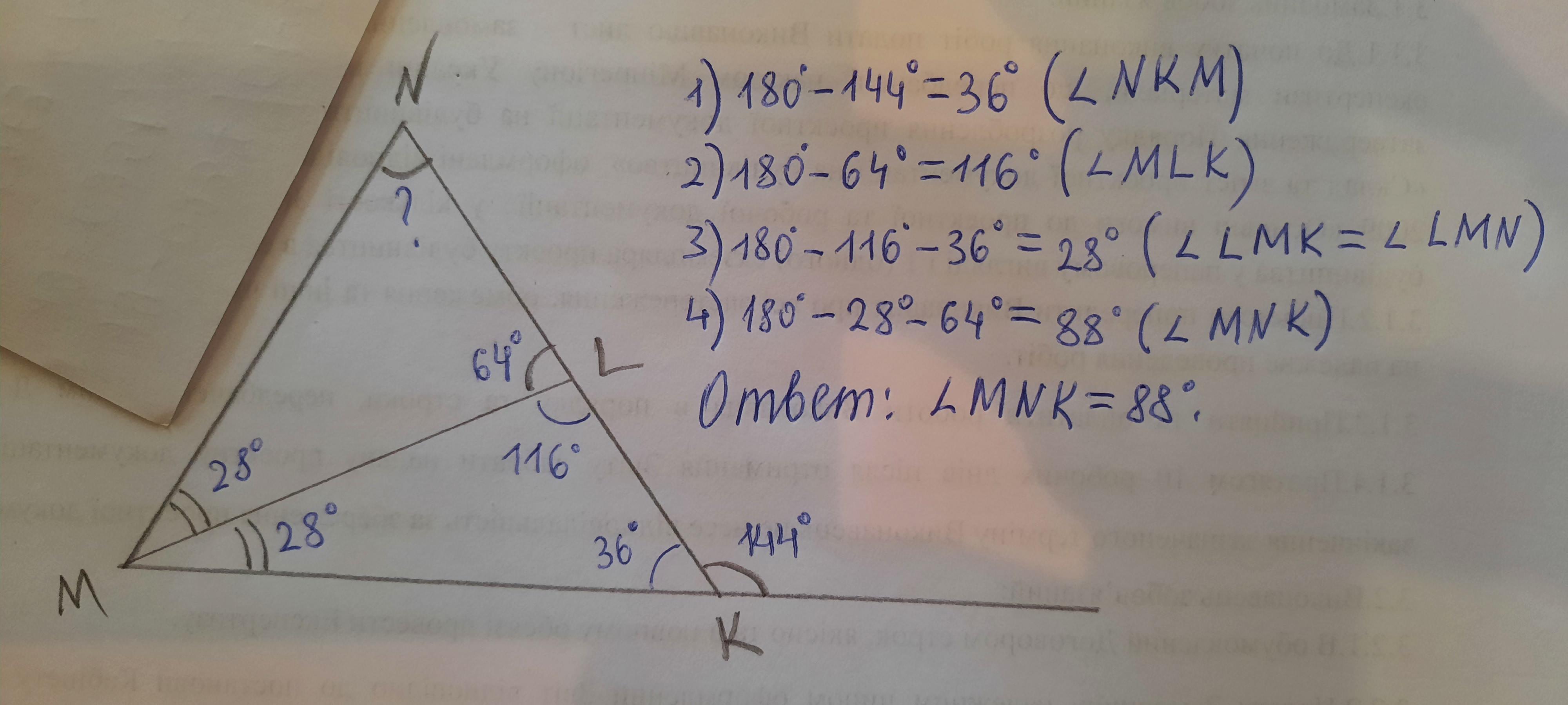 У ΔMNK ∠NKM = 180° - 144° = 36° . ∠ MLK = 180° - 64°= 116° ;