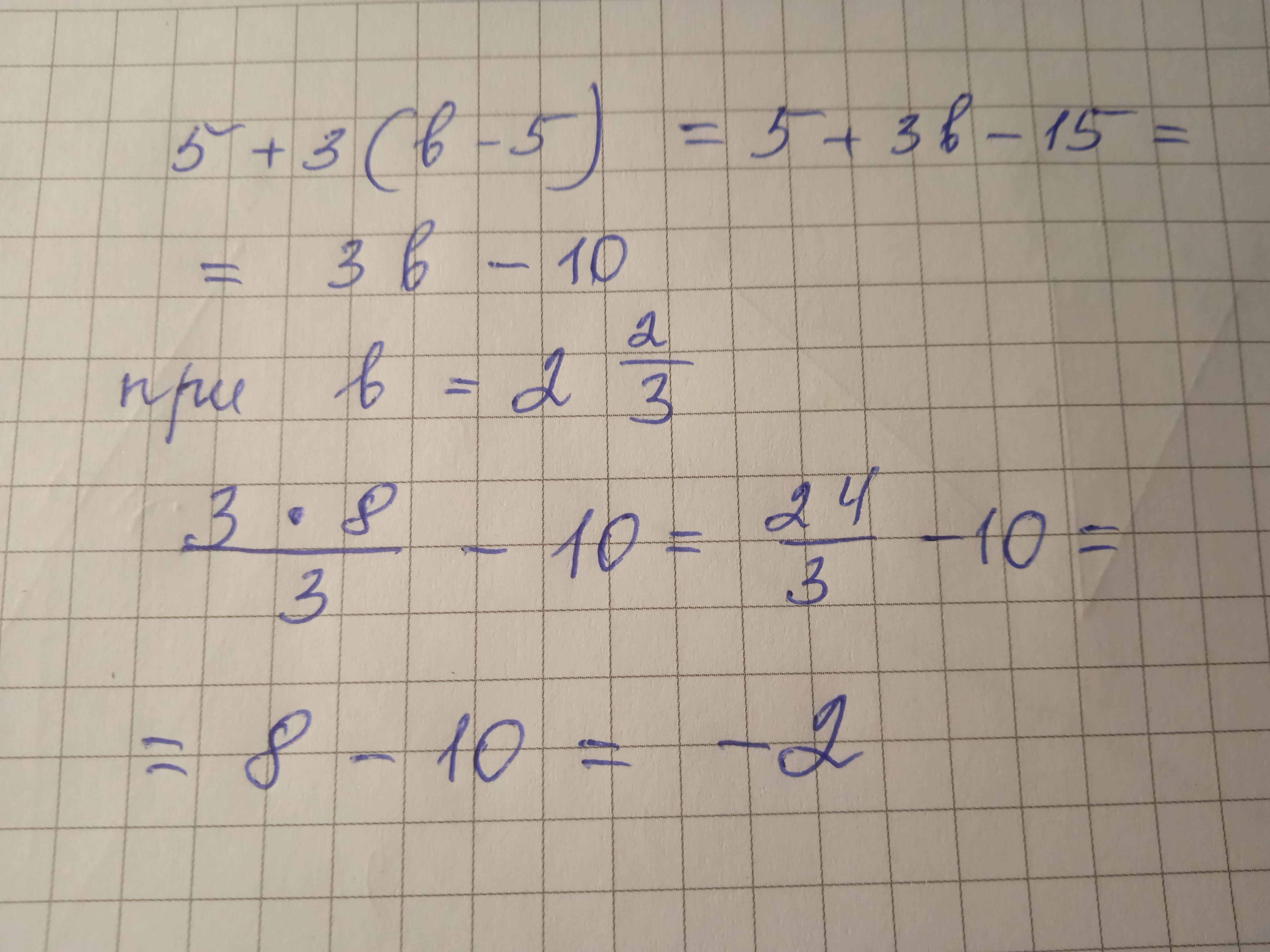 5+3(2 2/3-5) = 5+3(8/3-15/3) = 5+3((-(15/3-8/3)) = 5+3*(-7/3) = 5+(-7) = 5-7 = -2