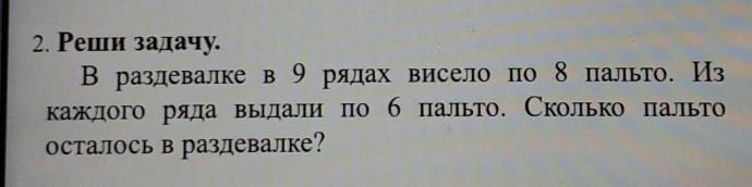 Когда из каждого ряда выдали по 6 пальто, то в каждом ряду осталось 8-6=2
