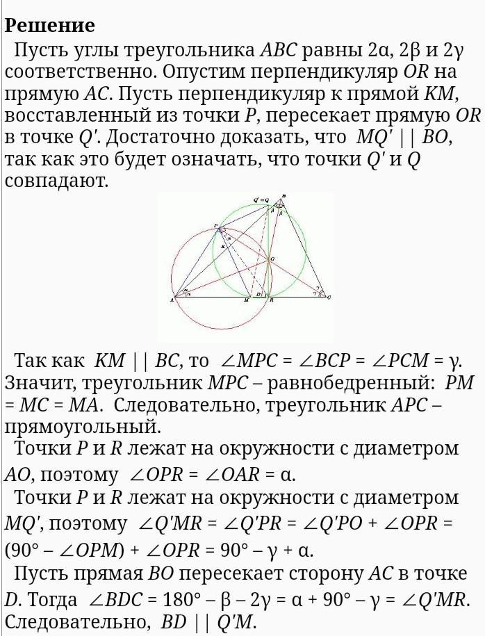 В треугольнике ABC ( AB > BC ) K и M — середины сторон AB и AC, O — точка пересечения биссектрис.
