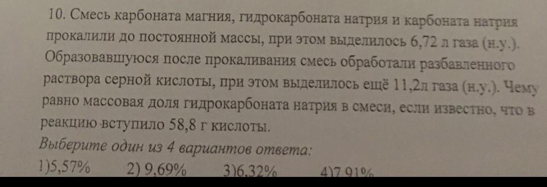 смесь карбоната магния гидрокарбоната натрия карбоната натрия прокалили до постоянной массы при этом выделилось 6 72 л газа образовавшуюся повести прокаливания смеси обработали разбавленного раствора серной кислоты при этом выделилось еще 11,2 л газа чему равно массовая доля гидрокарбаната натрия в смеси если известно что в реакцию вступило 58,8 г кислоты