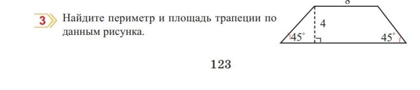 Нужно провести еще одну такую же высоту, тогда площадь трапеции будет равна сумме площади прямоугольника со сторонами 8 и 4 и двух прямоугольных равнобедренных треугольников с катетами 4.