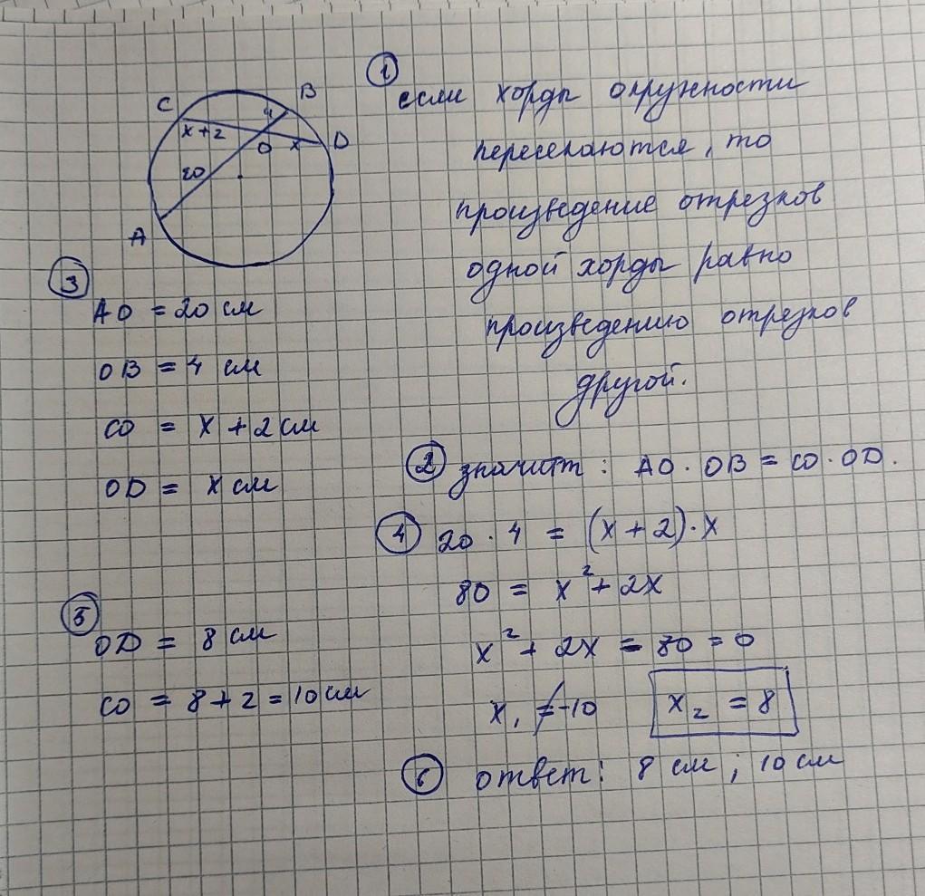 б) Хорда, перетинаючи другу хорду, ділить її на відрізки 20 і 4 см, і в свою чергу ділиться нею та відрізки, різниця між якими 2 см. Обчисліть довжину першої хорди. помогите срочно пожалуйста