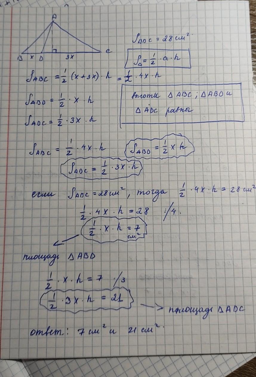 площадь треугольника АВС равна 28 см квадратных. точка Д делит сторону ВС в соотношении 3:1 считая от точки В. найдите площадь треугольников АВД и АСД