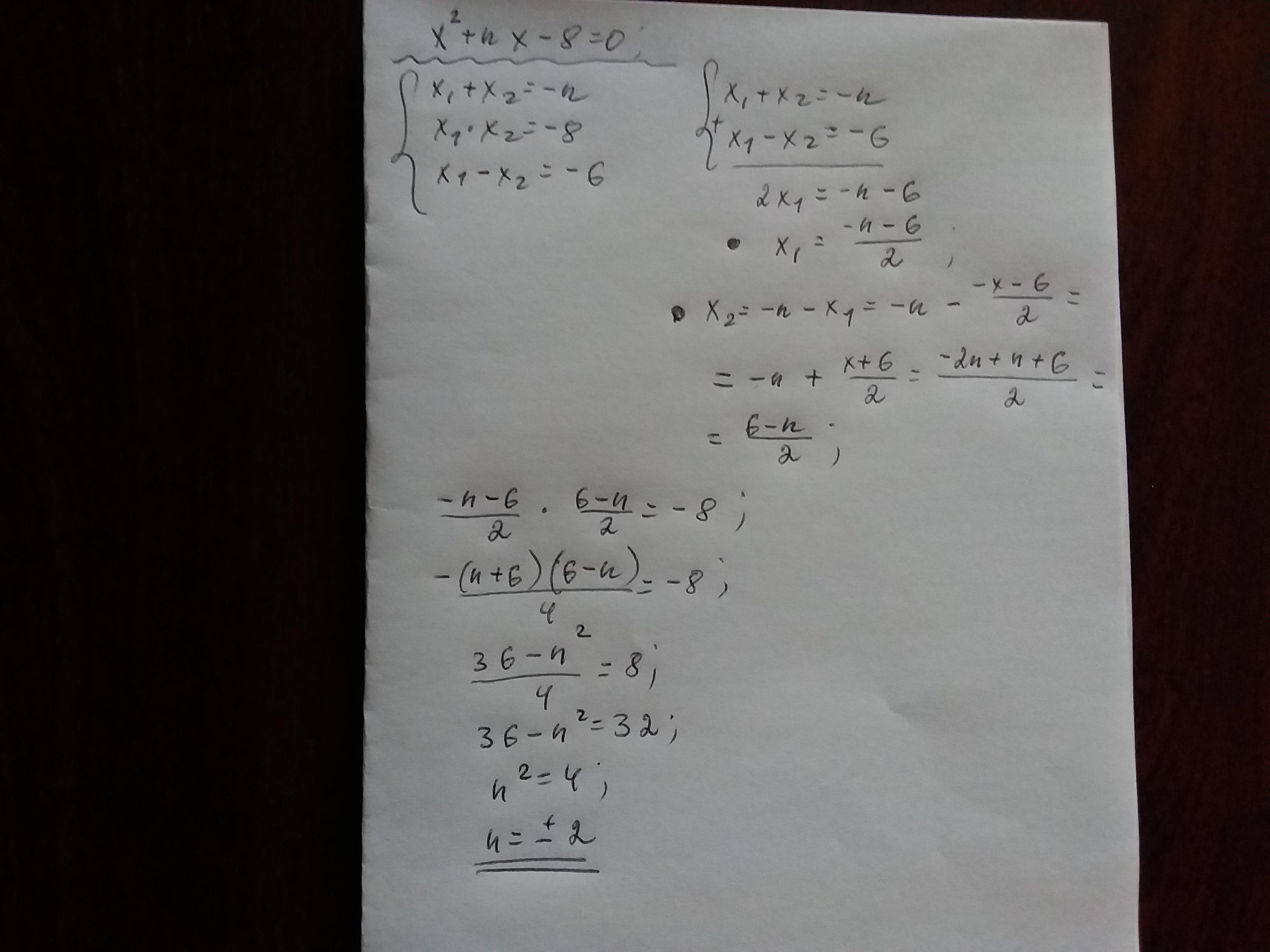 { x₁ - x₂ =- 6 ; x₁*x₂ = -8. ⇒ {x₁ = -4,x₂=2. или {x₁ = - 2,x₂=4. т.е. n = ± 2