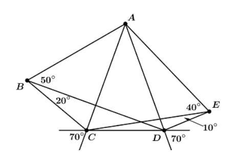 На плоскости расположен пятиугольник ABCDE такой, что ∠ACD=∠ADC=70∘, ∠ABD=50∘, ∠CBD=20∘, ∠AEC=40∘, ∠CED=10∘. При инверсии с центром в точке A точки B, C, D, E переходят в точки B′, C′, D′, E′. Выберите все равнобедренные треугольники.