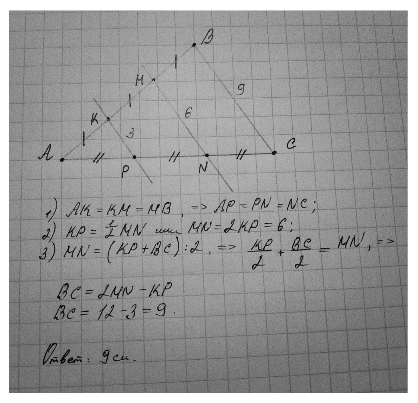 Из определения следует, что МN=(KP+BC)/2; 2MN-BC=KP; BC=12-3=9.
