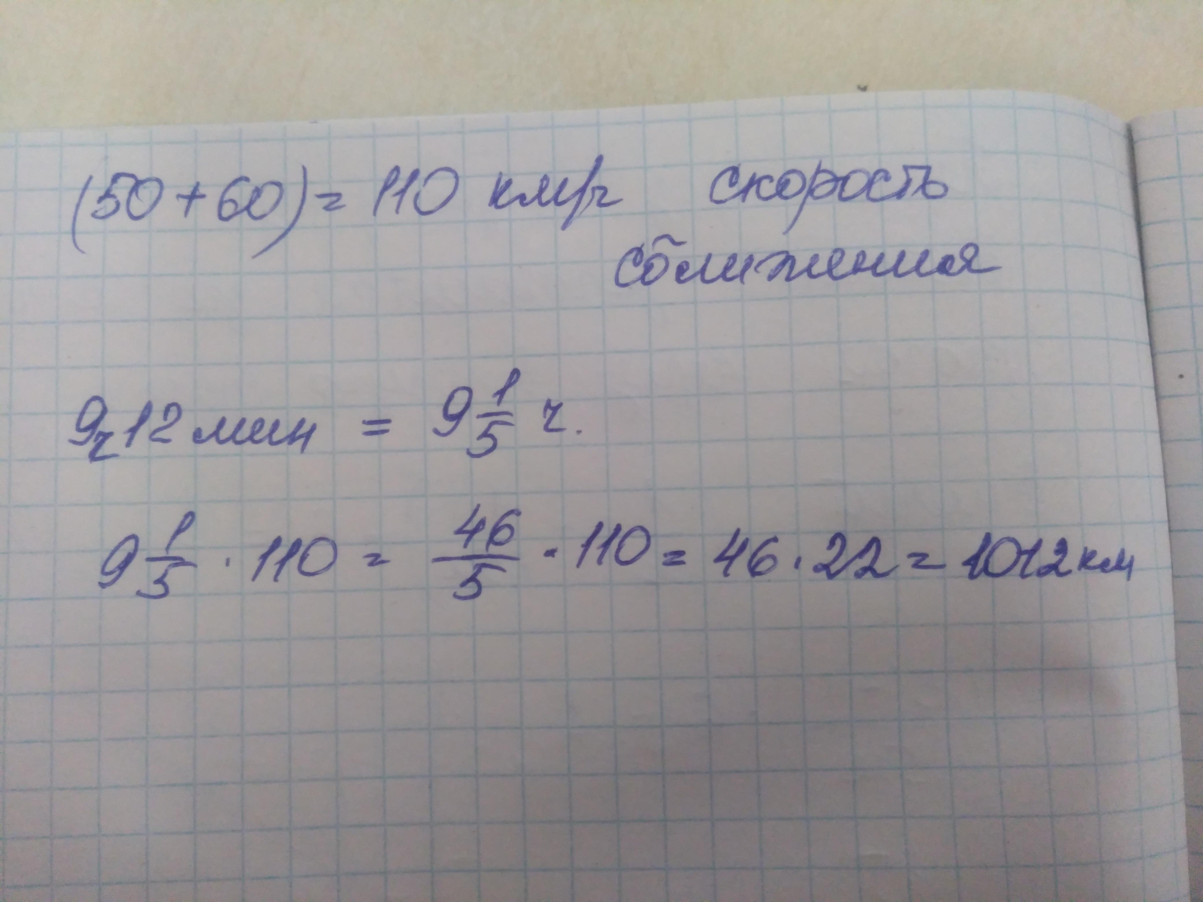 изХарькова и Львова на встечу друг другу одновремено выехали два поезда один ехал 50км/ч а второй 60км/ч встретились они через 9ч 12мин найдите растояние между городами