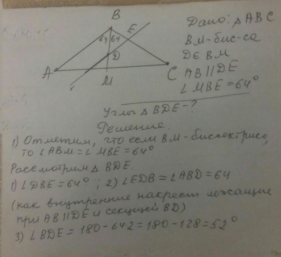 Через точку D, лежащую на биссектрисе Вм неразвер- нутого угла ABC, проведена прямая, параллельная пря- мой AB и пересекающая сто- рону ВС в точке Е. Найдите углы треугольника если ZMBE = 64°. ВDE,