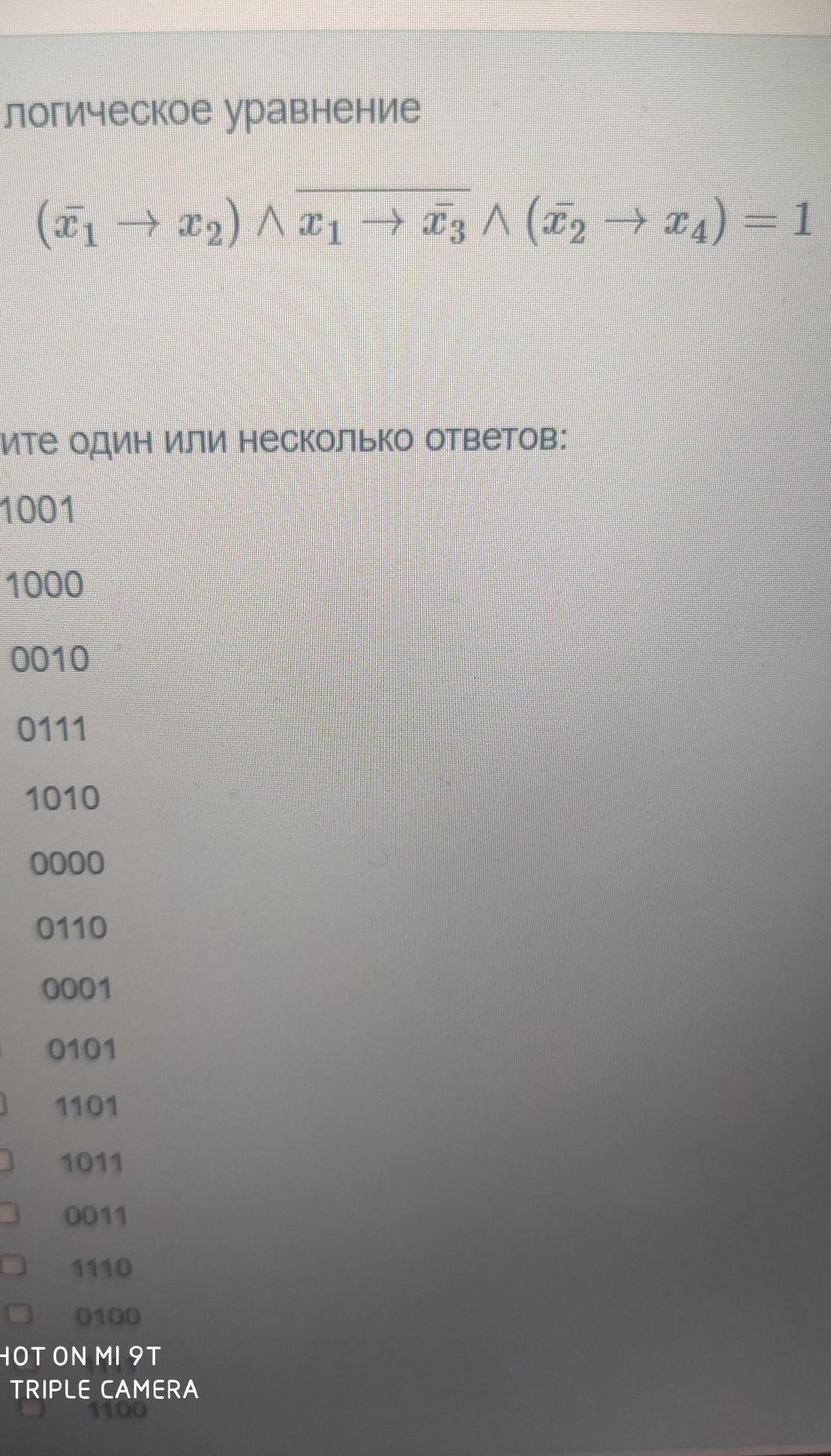 Если x4 = 0, то x2 = 1 => x1 = 0 и x3 = 0, но тогда двойное отрицание будет превращать часть выражения в ложь и выражение 1^0^1=1 - станет неверным.