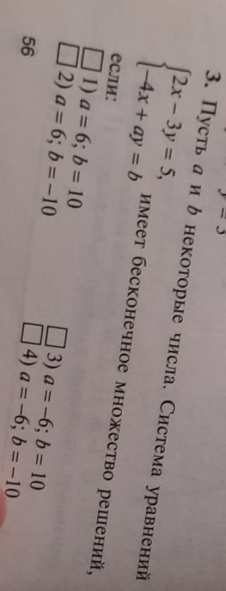 -3х - у= 3 3. Пусть аиь некоторые числа. Система уравнений (2x-3y = 5. имеет бесконечное множество решений, 4х + ay = b если: 1) а = 6; b = 10 O2) а = 6; b = -10 O3) а = -6; b = 10 4) а = -6; b = -10 56