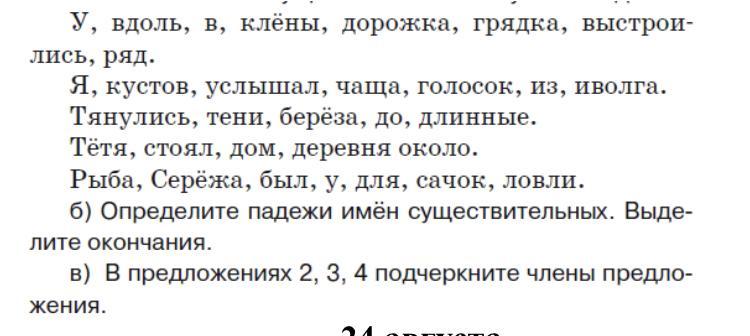 Вдоль дорожки(Р.п.) у грядки(Р.п.) выстроились в ряд(В.п.) клены(И.п.).