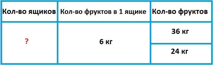 В ящики каждый из которых вмещает по 6кг фруктов разложили 36 кг яблок и 24кг груш.Сколько всего ящиков потребувалось