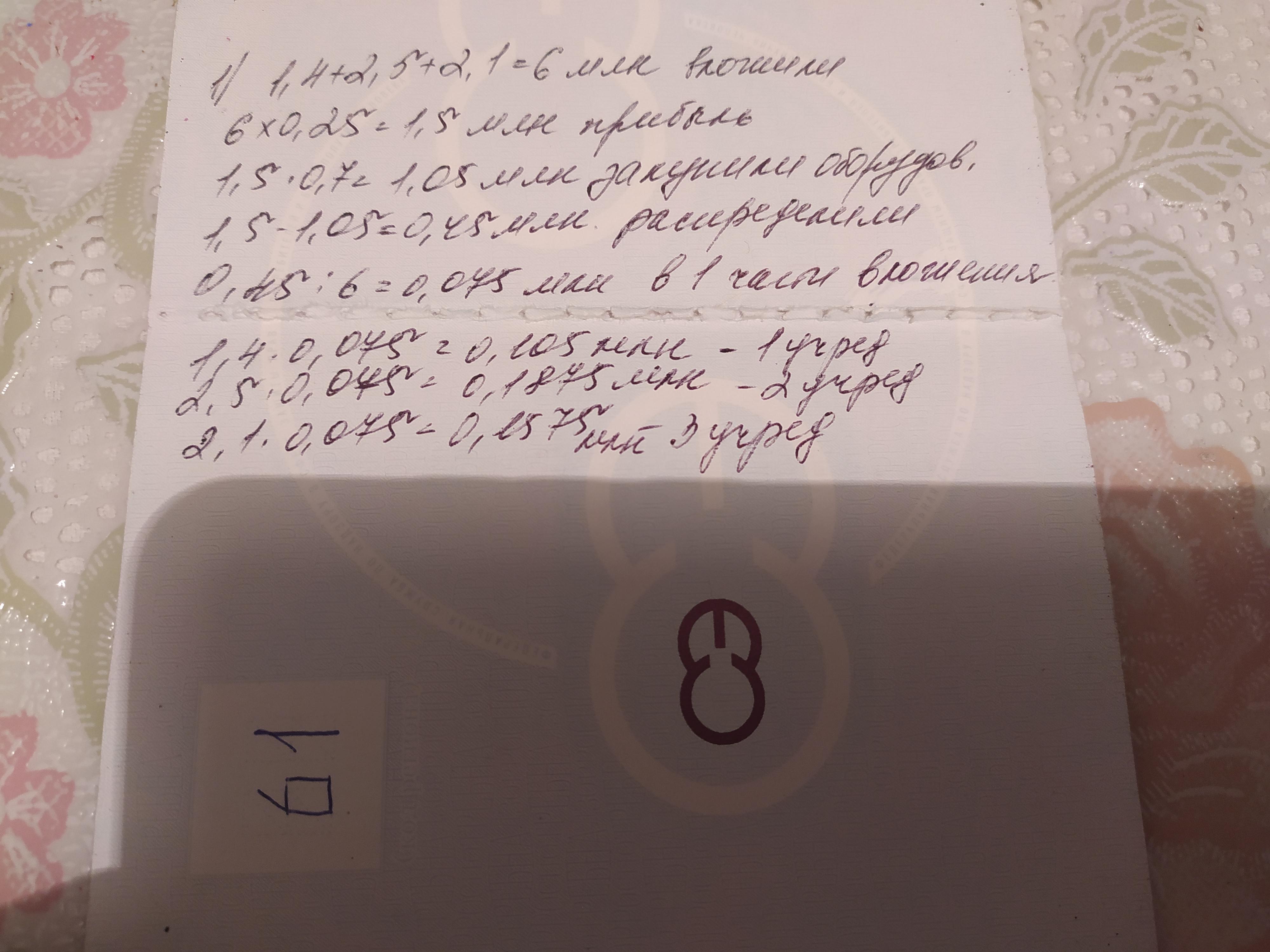 решить задачутри предприниматели вложили в проект соответственно 1,4 млн руб 2,5 млн руб 2,1 млн рублей проект принес 25% прибыли на 70% полученной прибыли они закупили оборудование остальные деньги распределили пропорционально вложенным