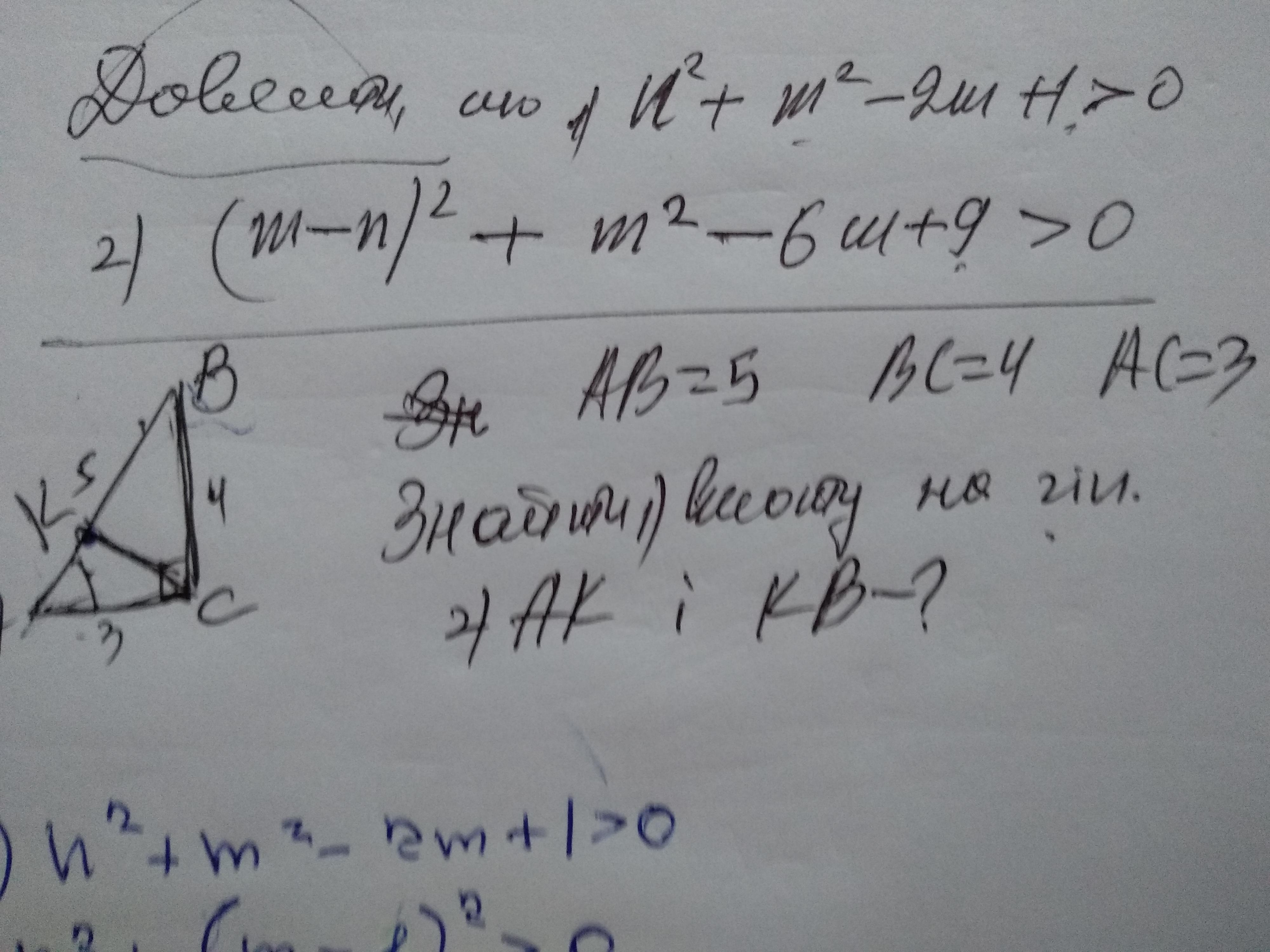 АВ = 5, BC = 4, AC = 3. Найти: 1) высоту на гипотенузу; 2) АК; 3) КВ.