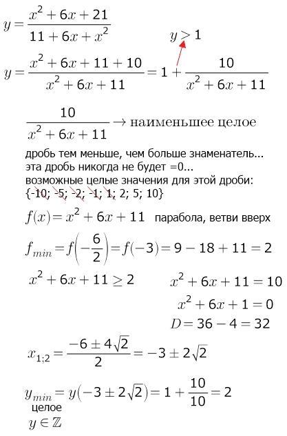 1 < y ≤ 6 (в принципе, уже очевидно, что наименьшее из целых значений функции это 2)))