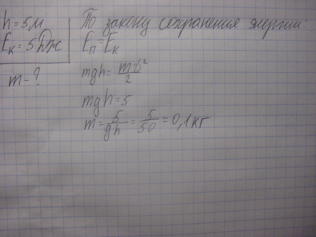 камень свободно падает с высоты 5 метров,в нижней точке траектории обладал кинитической энергией 5 Дж .определите массу камня?