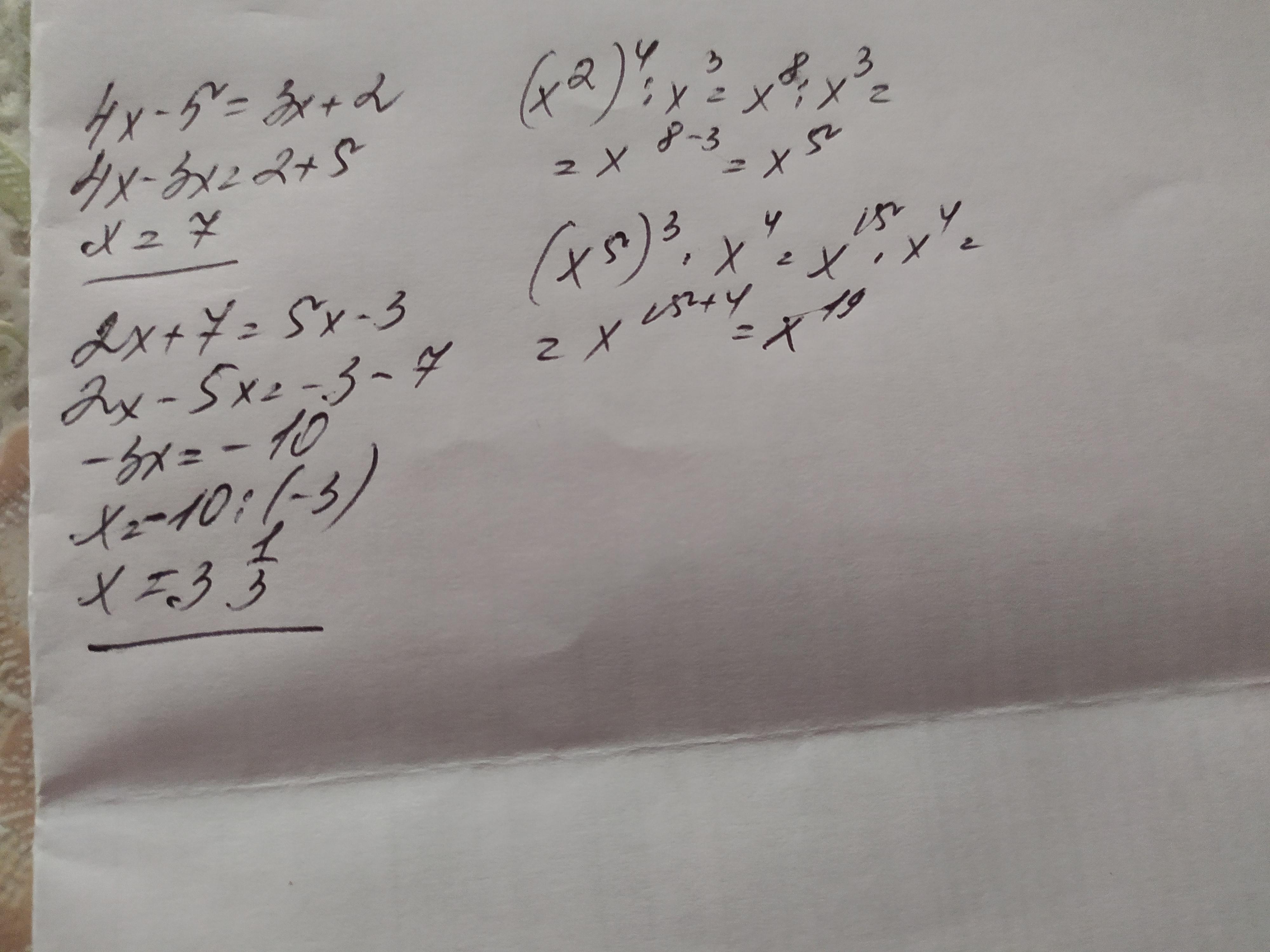 розвязати будьласка на сьогодні 4х-5=3х+2 ; 2х+7=5х-3; (х квадраті )4степені : х 3степені; (х5степені)3степені • х4степені
