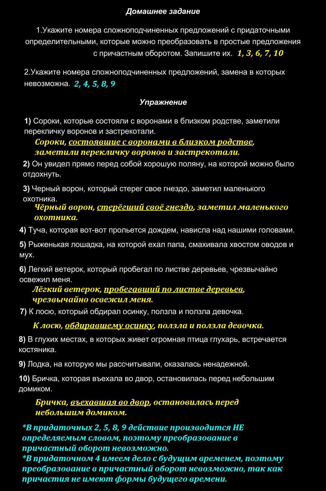 2. задания я сделал, мне учительница сказала, что тут только 4 невозможно. И как по мне это 2,5,8 и 9. А вот 1. задание где надо заменить причастным оборотом сложновато, помогите пожалуйста..