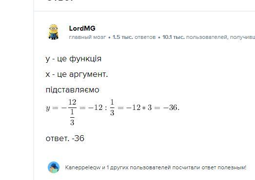 Функцію задано формолую у=-12/х визначте значення функції, якщо значення функції аргументу дорівнює 1/3