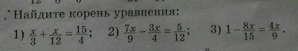 2) 7x/9 - 3x/4 = 5/12. 28x - 27x = 15 x = 15 3) 1 - 8x/15 = 4x/9 45 - 24x = 20x 45 = 24x + 20x
