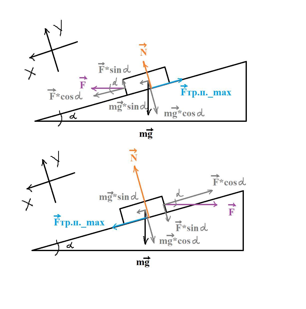 OX: F*cosα + mg*sinα - Fтр.п._max = 0