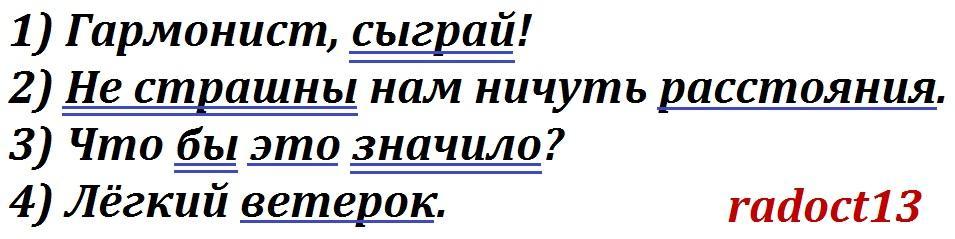 укажите предложение в котором верно выделена грамматическая основа 1) Гармонист, сыграй! 2) Не страшны нам ничуть расстояния. 3) Что бы это значило? 4) Лёгкий ветерок