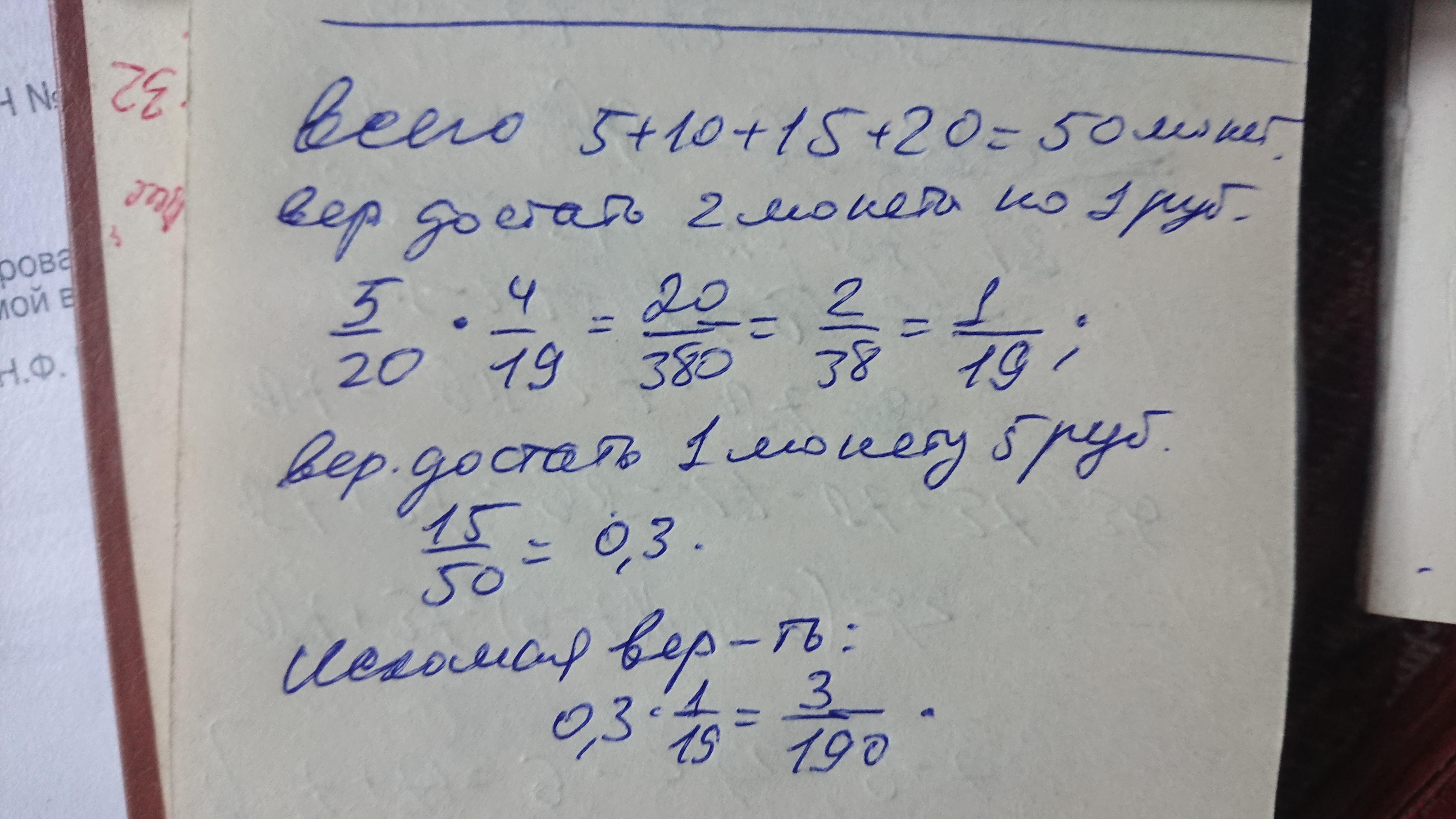 В копилке лежат 5 монет по 1 руб, 10 монет по 2 руб, 15 монет по 5 руб и 20 монет по 10 руб. Ваня пытается вытряхнуть случайным образом монеты из копилки. Какова вероятность, что в числе первых трёх выпавших монет будут 2 монеты по 1 руб и 1 монета в 5 руб?