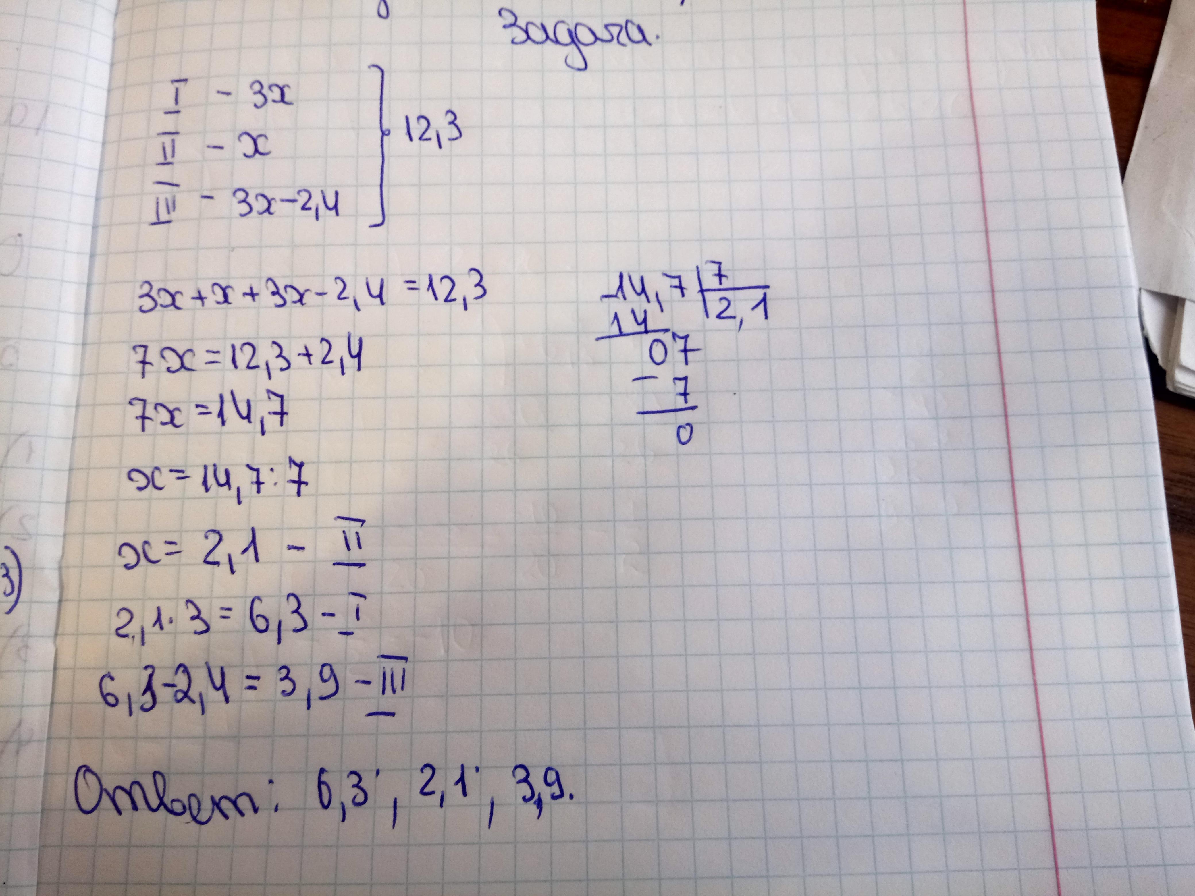 3х+х+3х-2,4=12,3, х=2,1, числа: 6,3; 2,1; 3,9
