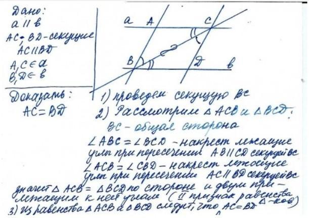 Параллельные прямые а и b пересекаются с параллельными прямыми AB и CD ,так что точки А и С принадлежат прямой а, а точки В и D — прямой b. Доказать, что AC = BD.