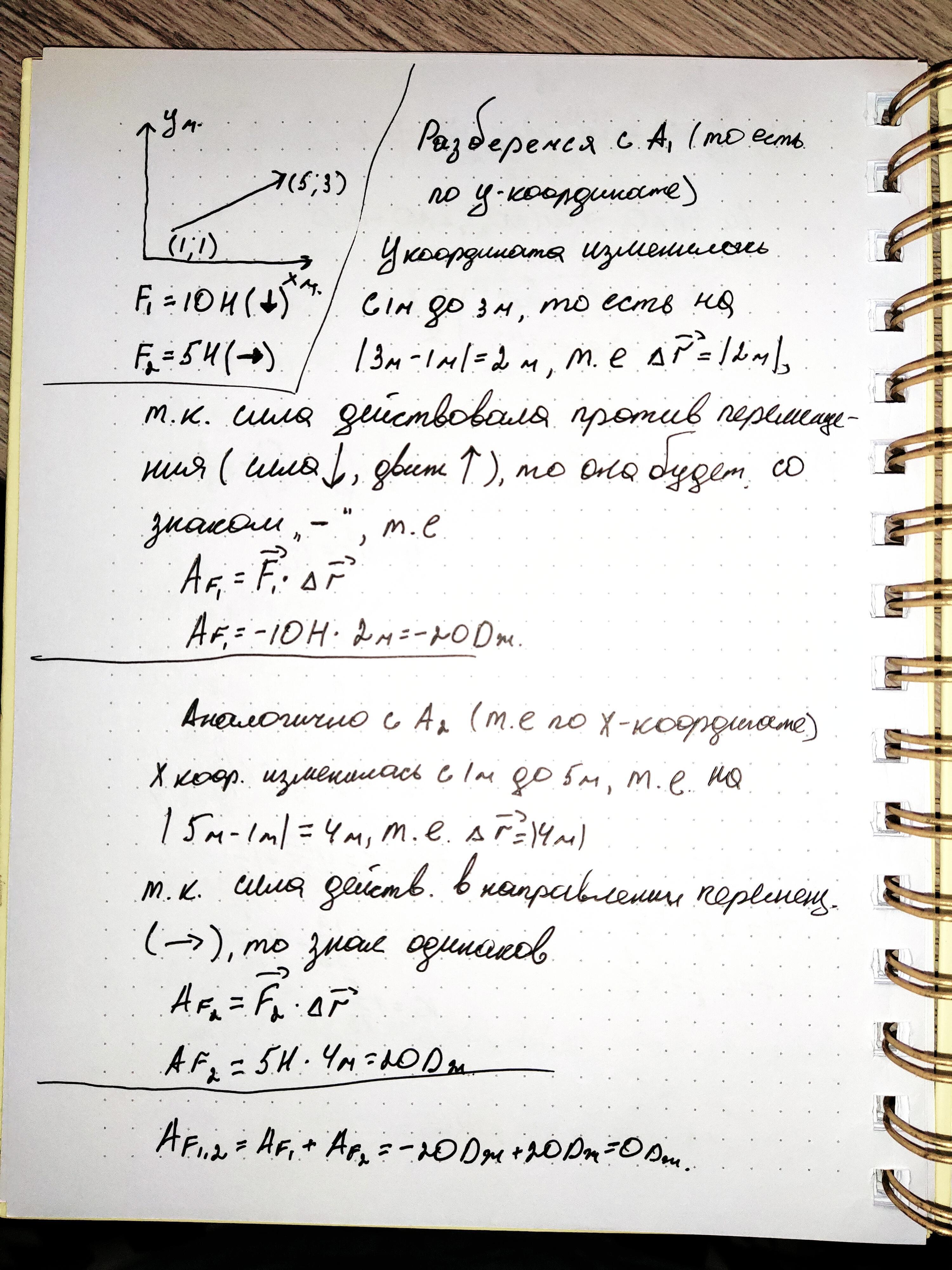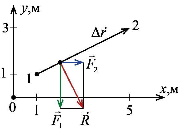 Пожалуйста помогите! Важнейший пример скалярного произведения в физике – работа силы. Если на частицу, движущуюся по прямой, действует постоянная сила `F`, то механической работой `A` этой силы при перемещении частицы `Δr` называют скалярное произведение `Af=F*Δr`. Пусть материальная точка переместилась из точки `1` в точку `2`. Все числовые данные указаны на рис. 52. В процессе движения на тело действовали (кроме других) две постоянные силы – «вертикальная» (вниз) `F1=10 "Н"` и «горизонтальная» (вправо) `F2=5 "Н"`. Вычислите работы обеих сил `A(F1,12)`, `A(F2,12)`, а также сумму этих работ и работу равнодействующей этих двух сил `A(R,12)` `(R=F1+F2)`. Нельзя ли было сразу догадаться, что работа `A(R,12)` будет иметь именно это значение?
