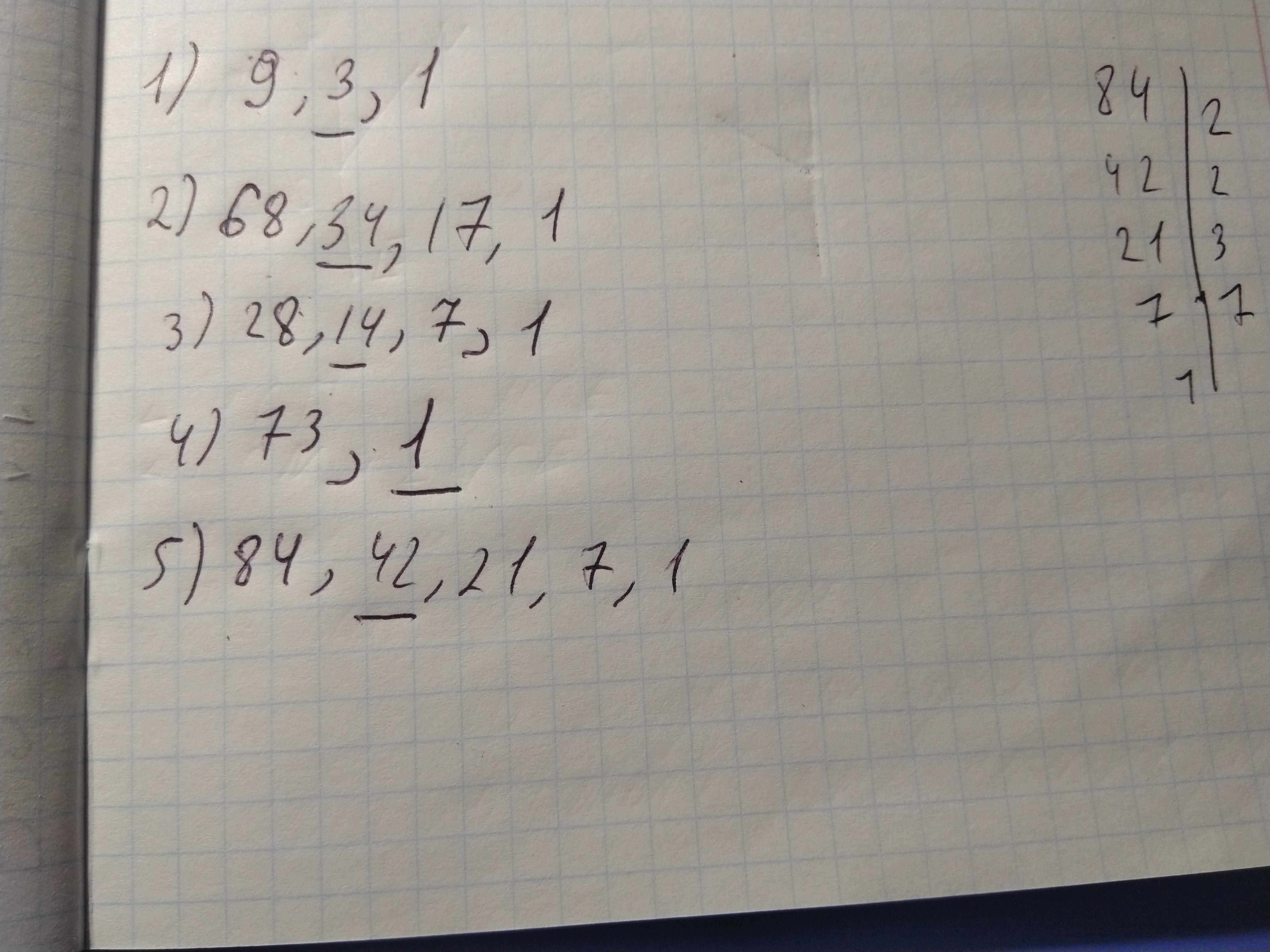 Найдите все делители чисел.Подчеркните наибольший делитель,не равный самому числу. 9;68;28;73;84 плиииз