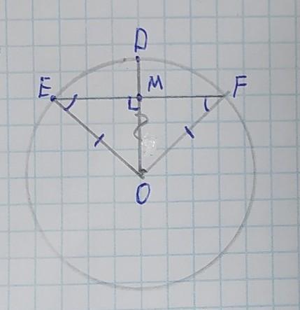 ∆ОМФ и ∆ОМЕ- прямоугольные треугольники. ОМ- общая сторона. ЕМ=МФ, свойство хорд. ∆- ки равны по первому признаку прямоугольных треугольников. По двум катетам.