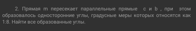 Исходя из отношения 1:8 найдем величины этих меньшего и большего угла. 180 градусов делим на 8+1