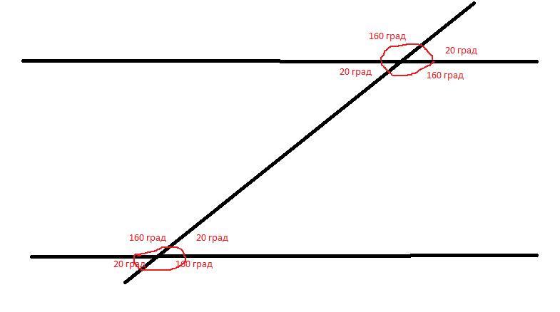 Вроде как ещё есть какая-то теорема или типо того, что углы по диагонали, образованные от пересечения двух прямых, равны. то есть в данном случае 20 град равно 20 град и т.д.