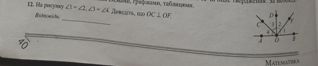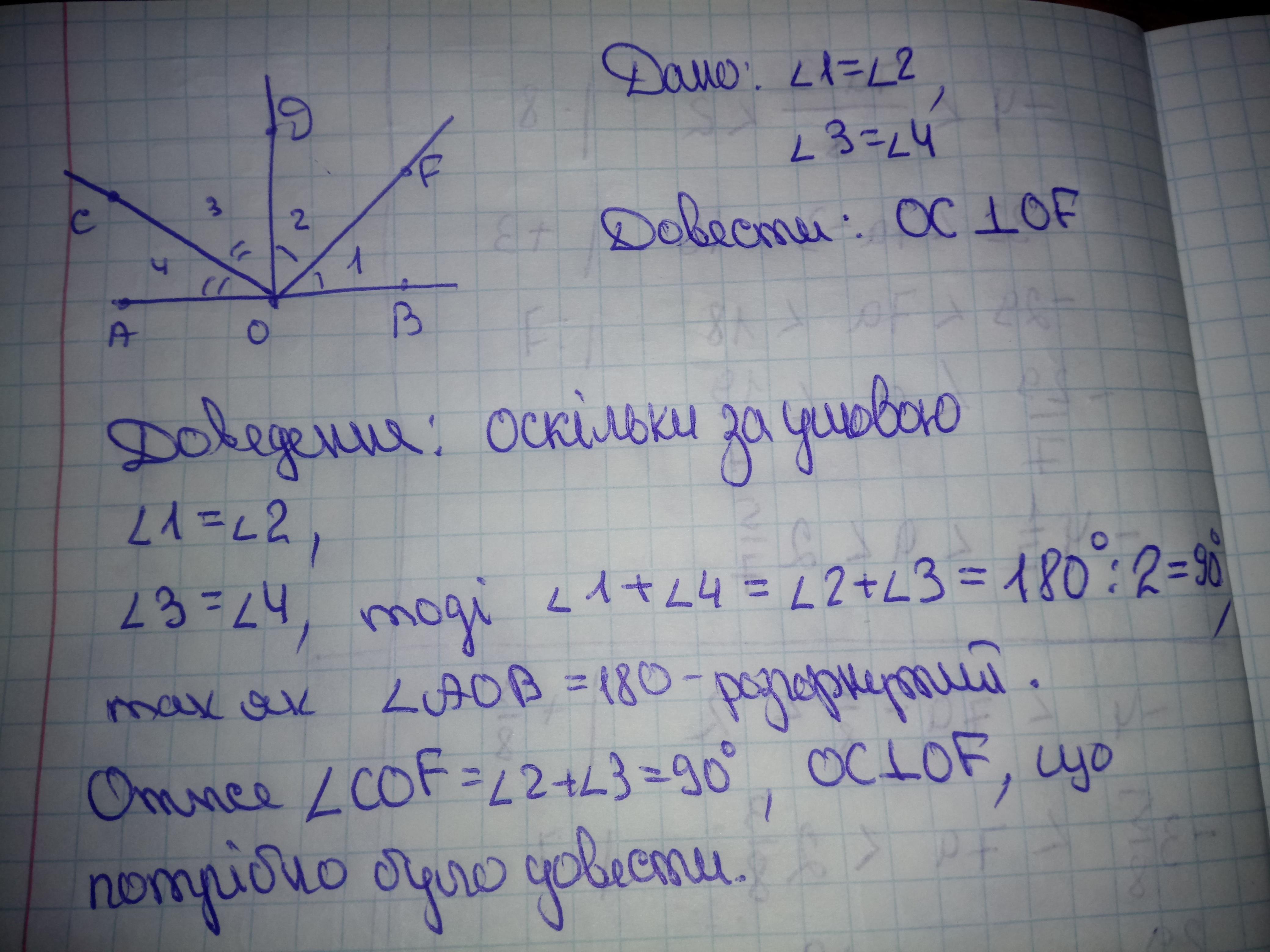 Пусть угол 1=х, 2=х, тогда 3=у; 4=у. <АОВ=180°, развернутый угол уравнение х+х+у+у=180° 2х+2у=180°; 2(х+у)=180; х+у=180/2; х+у=90 что и требовалось доказать.