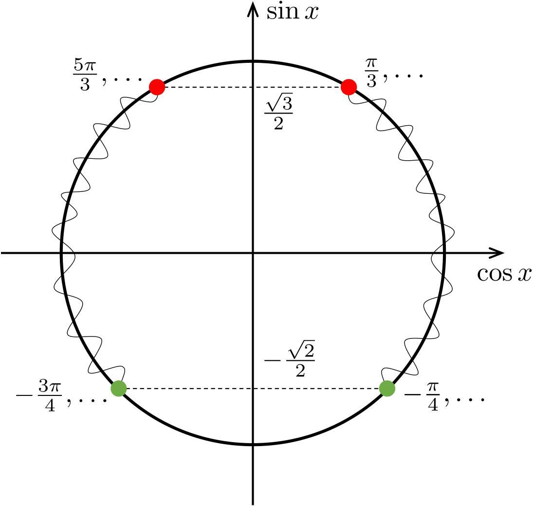 Изобразим решение на единичной окружности (см. приложенный Рисунок).