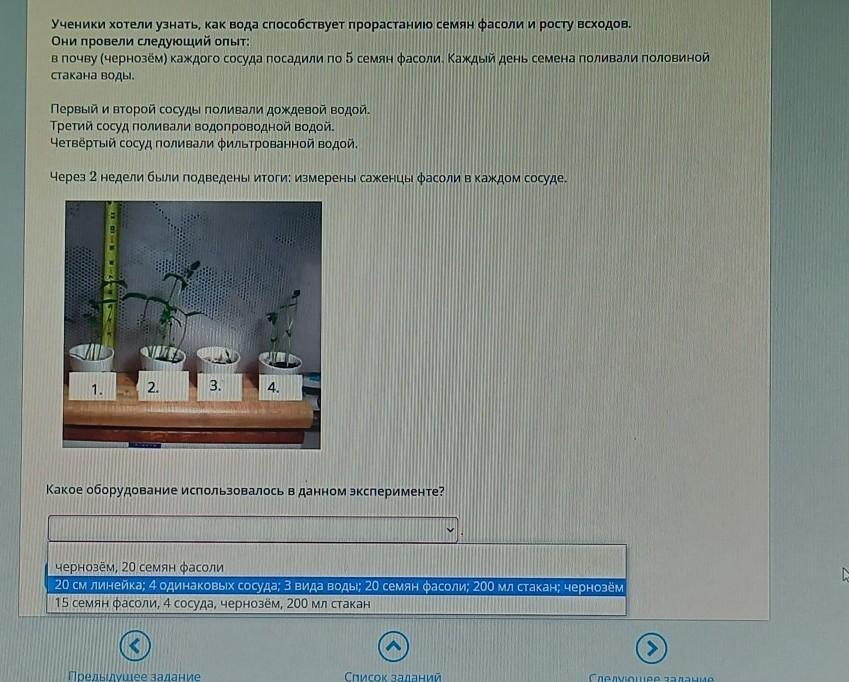 Ознакомься с проведённым учениками опытом и ответы на вопрос. Ученики хотели узнать, как вода способствует прорастанию семян фасоли и росту всходов. Они провели следующий опыт. в почву (чернозём) каждого сосуда посадили по 5 семян фасоли. Каждый день семена поливали половиной стакана воды. Первый и второй сосуды поливали дождевой водой. Третий сосуд поливали водопроводной водой. Четвёртый сосуд поливали фильтрованной водой. Через 2 недели были подведены итоги: Измерены саженцы фасоли в каждом сосуде. 1. 2. . 3. 4. Какое оборудование использовалось в данном эксперименте?